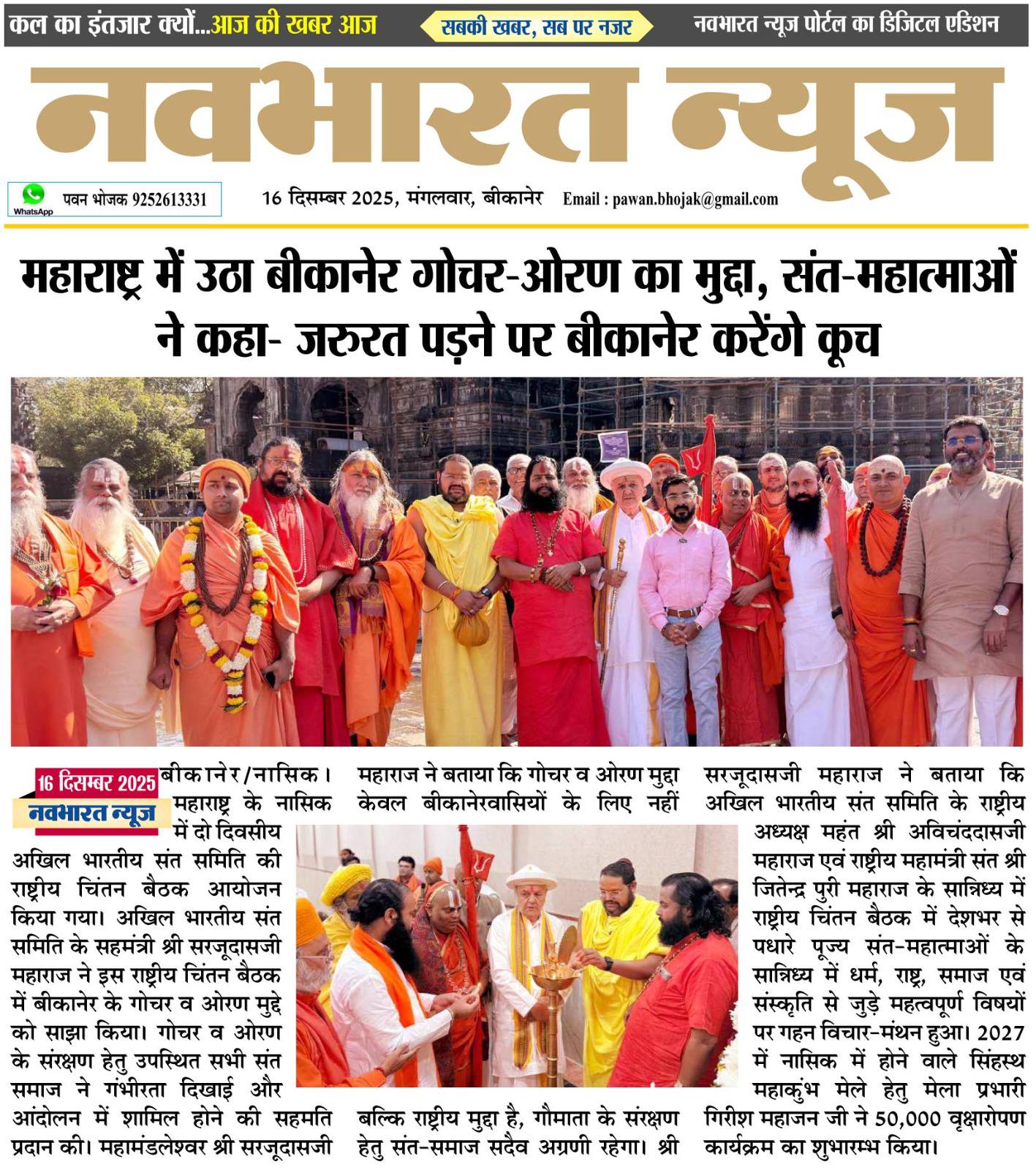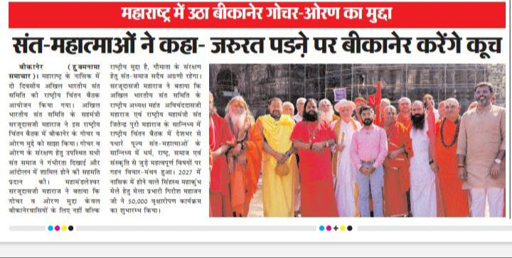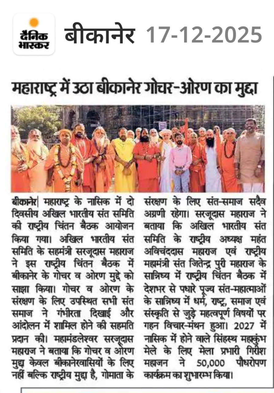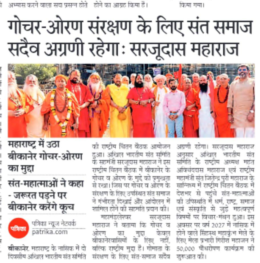 महाराष्ट्र नासिक में अखिल भारतीय संत समिति की राष्ट्रीय चिंतन बैठक में संत-समाज द्वारा समर्थन।